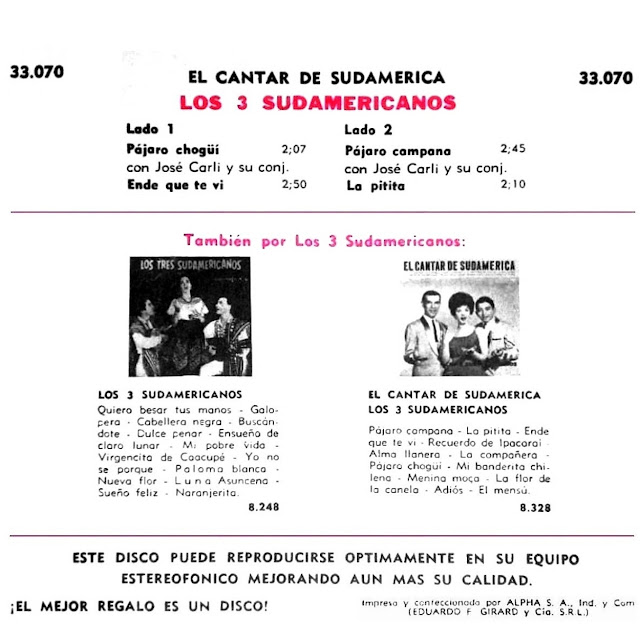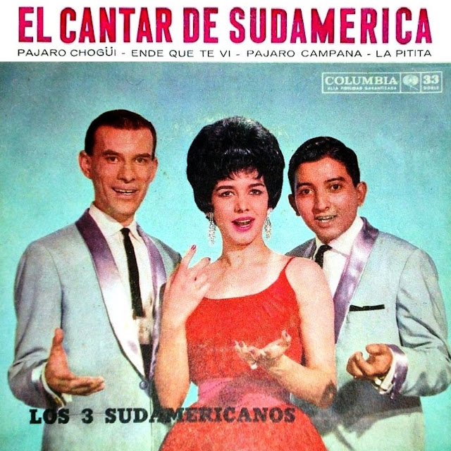 Hoy viernes voy a compartir con todos los queridos amigos, seguidores y visitantes de este sitio, el primer disco simple de doble duración que LOS 3 SUDAMERICANOS grabaran en el año 1960 en Argentina, con el título "El cantar de Sudamérica Vol. 1". Con su inconfundible estilo vocal, este excelente trío paraguayo de voces mixtas, nos interpreta cuatro canciones sudamericanas, como la polca paraguaya "Pájaro chogüí", la simpática tonada chilena "Ende que te ví", la galopa "Pájaro campana" -que como comenté en otro álbum publicado hace breves días de LOS 3 SUDAMERICANOS, su letra fue compuesta por Julio Eduardo Ortega Rayo especialmente para que la cantaran Alma María, Casto Darío y Johnny Torales- y la alegre y divertida polca peruana. "La pitita". Este albumcito también es UNA PRIMICIA PARA EL BLOG, pues no lo he visto en ningún otro sitio Web aún publicado. Los invito pues a que pasen y vean, descarguen y escuchen este pequeño gran disco. Les puedo asegurar sin duda... QUE JAMÁS SE VAN A ARREPENTIR...!!!.